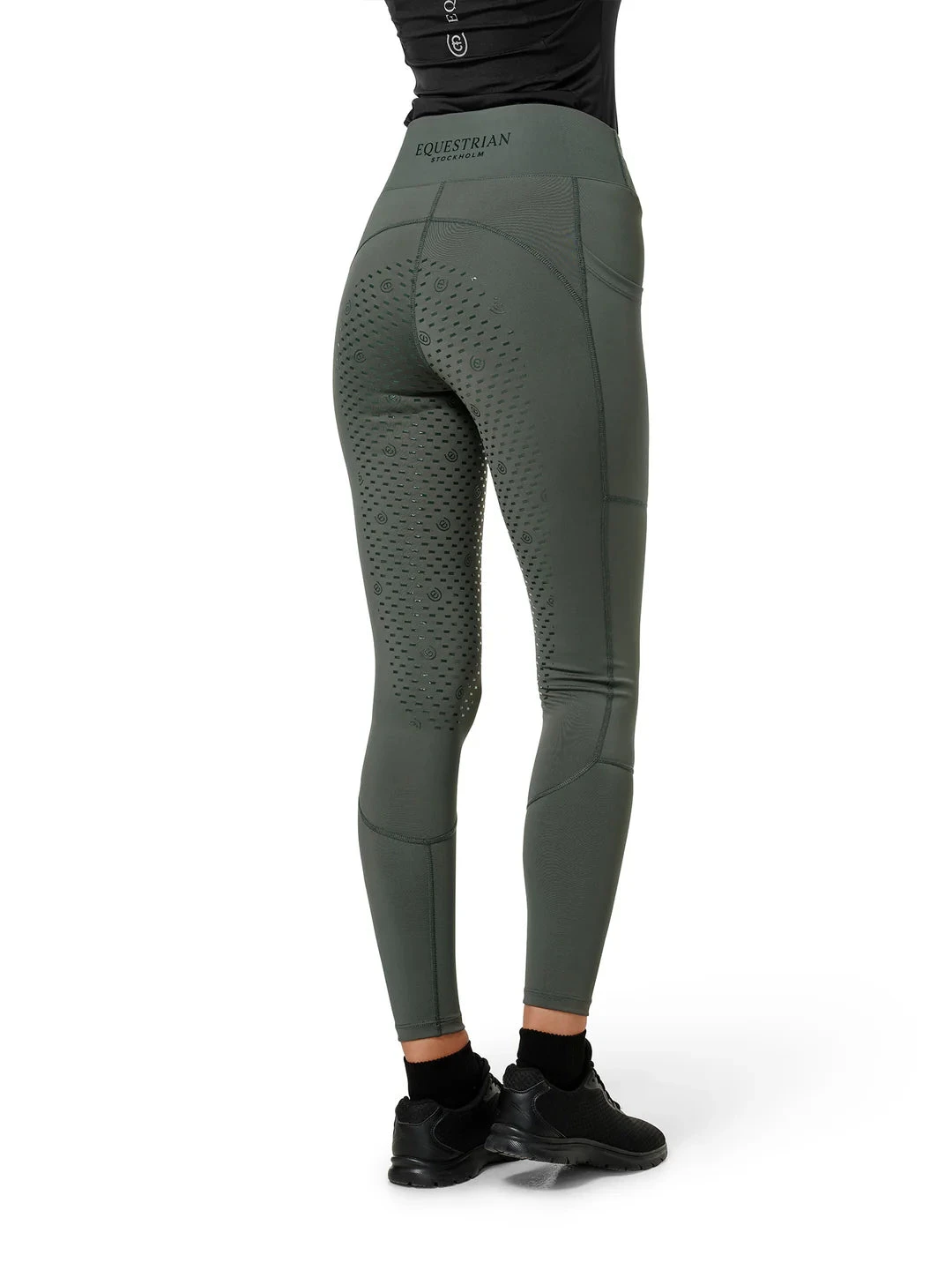 This design is meant to ensure that the rider can move freely and comfortably, while also receiving the necessary support to help them perform at their best. The Equestrian Stockholm Riding Tights Dressage Movement come in a beautiful cold army green color and are equipped with large side pockets on both sides, making it easy to store a phone. The Equestrian Stockholm Riding Tights Dressage Movement are decorated with a black printed ES logo on the left pocket and a beautiful black printed Equestrian Stockholm logo on the center of the waistband.