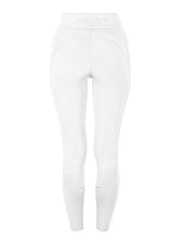 This design is meant to ensure that the rider can move freely and comfortably, while also receiving the necessary support to help them perform at their best. The Equestrian Stockholm Riding Tights Jump Movement come in a beautiful white color and are equipped with large side pockets on both sides, making it easy to store a phone. The Equestrian Stockholm Riding Tights Jump Movement are decorated with a tone-on-tone printed ES logo on the left pocket and a beautiful tone-on-tone printed Equestrian Stockholm logo on the center of the waistband.