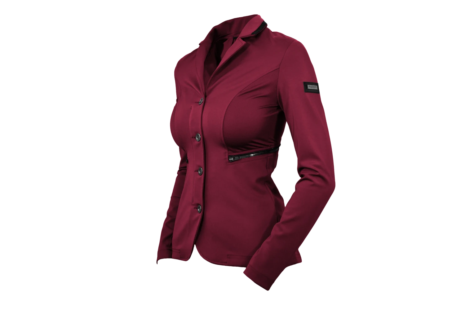 The competition jacket is made in beautiful Bordeaux colour and decorated with small, beautiful black glittery details that will make you stand out during competitions. Designed with 4-buttons at the front with a hidden zip closure underneath to maintain a sleek look. What is great about this jacket is that it is washing machine safe, this saves you time so you can focus on your next competition and achieve your dreams. It also utilises recycled yarn which has a lower environmental impact. The competition jacket is decorated with an Equestrian Stockholm badge in black.