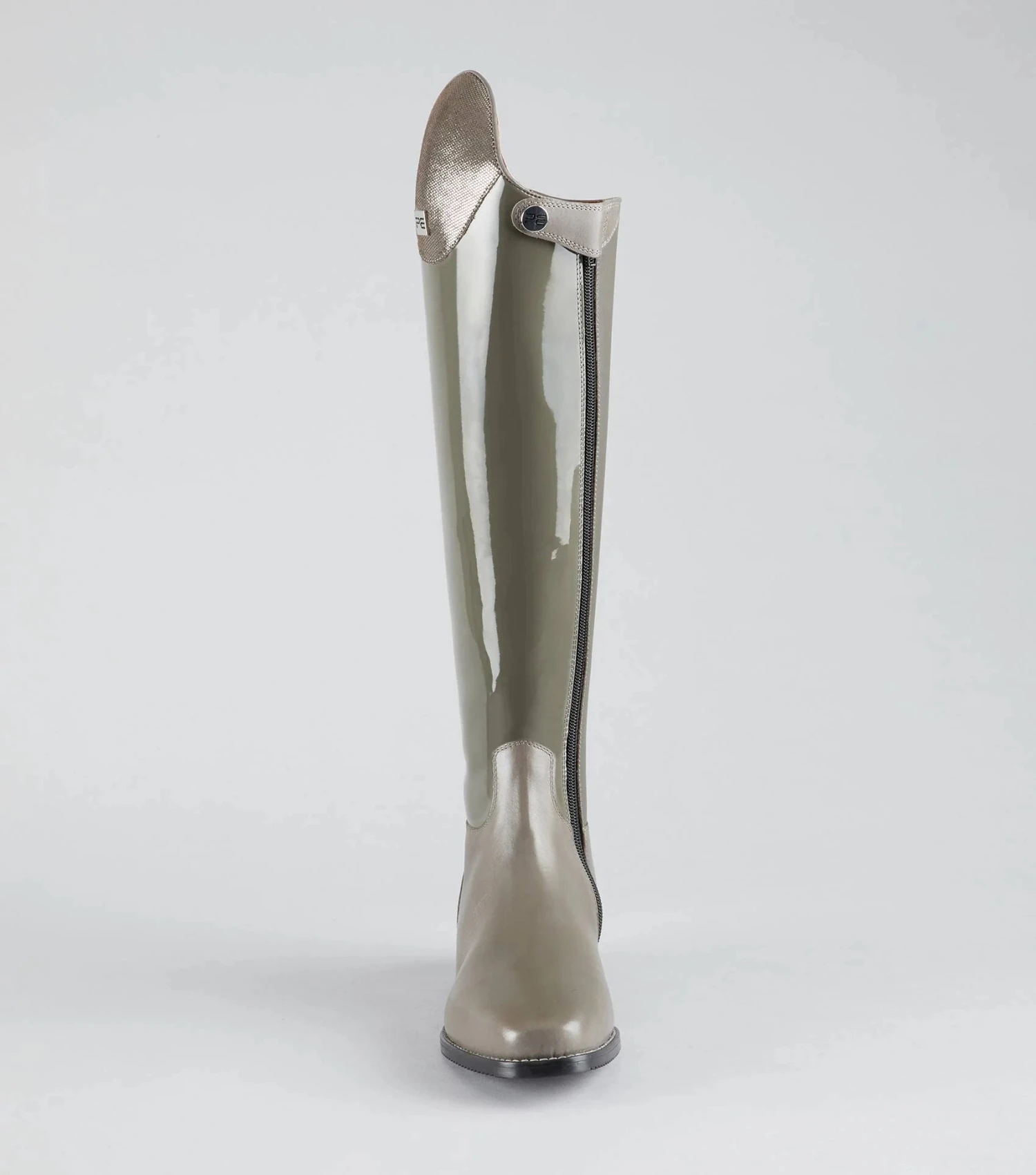 These exceptional long leather horse riding boots are crafted specifically for dressage from high-quality European and patent leather. The traditional knee-high length is embellished with patent leather around the outer calf and a metallic detailing at the knee. Offering sophisticated appearance during everyday leisure or competition use.